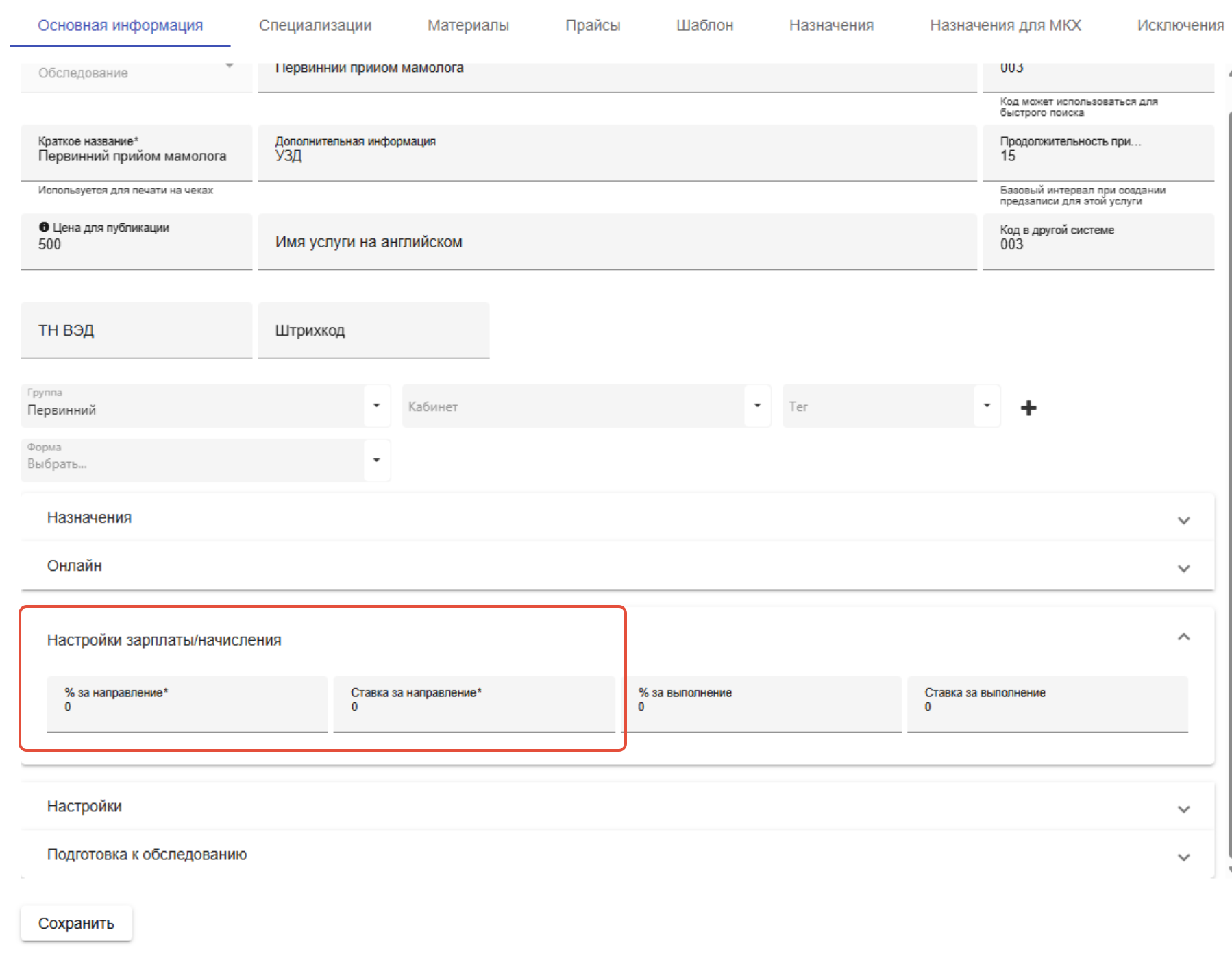 - Ставка и процент - за выполнение услуг. Будут подставляться при настройке заработных ставок врачей (необязательно);