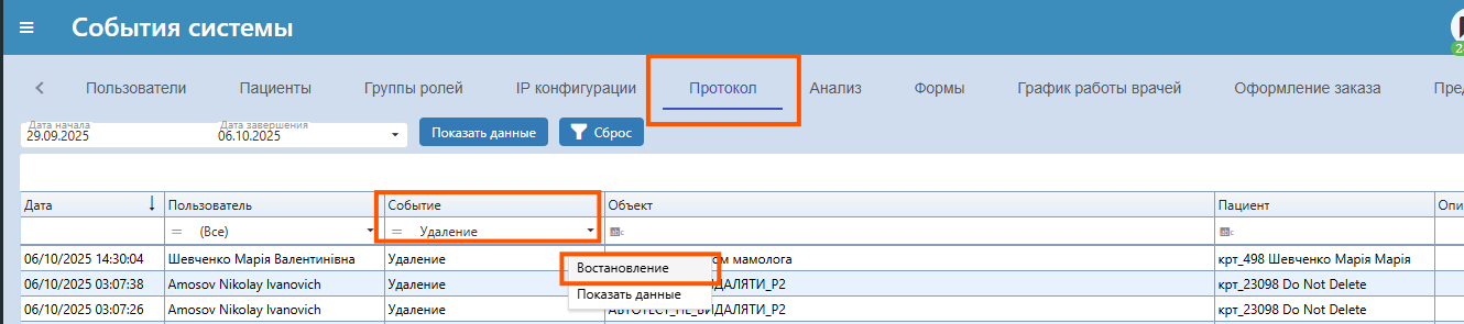 ПРИМЕЧАНИЕ: Если услуга была удалена случайно, но Вы точно уверены, что там было заключение и оно было сохранено, в таком случае у Вас есть возможность восстановить удаленную услугу. Находите в столбце "Пациент" нужного, выставляете фильтр "Событие" - "Удаление" и нажимаете ПКМ - "Восстановление" (ниже пример). Услуга возобновится в КП пациента, где Вы сможете работать с ней.