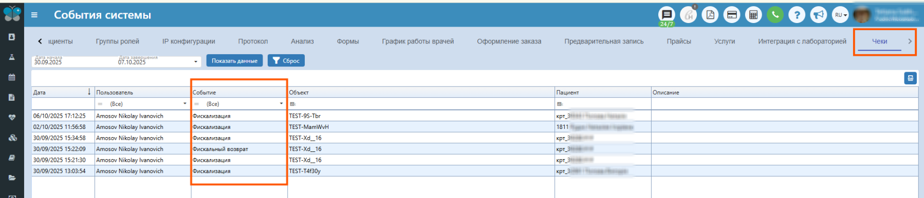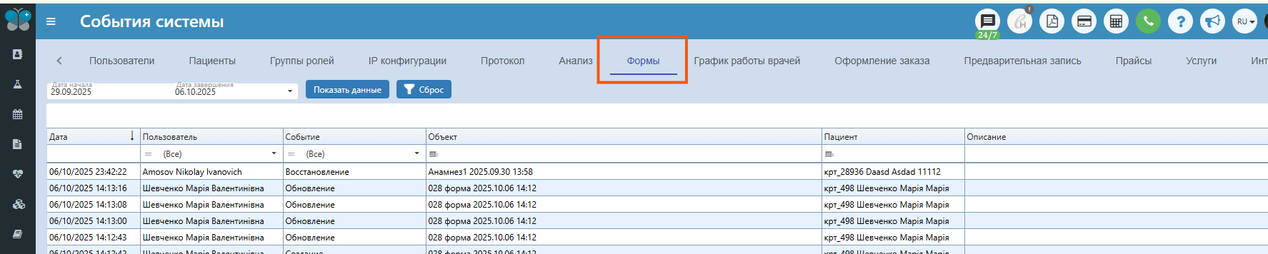 Эта вкладка показывает события, связанные с изменениями в формах в карте пациента: