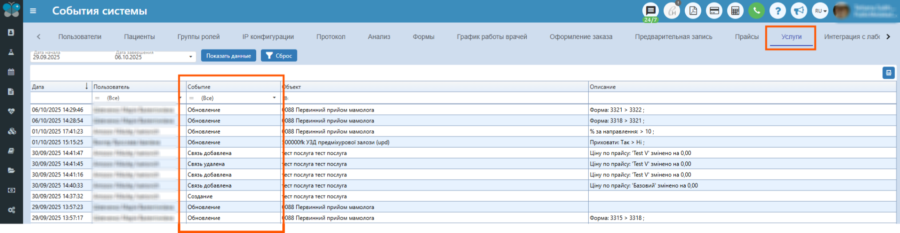 2) Обновление – кто и когда редактировал заказ (при этом в колонке Объект отображаются данные об услуге (анализ) в котором происходили изменения, а в колонке Описание – какие именно были изменения);