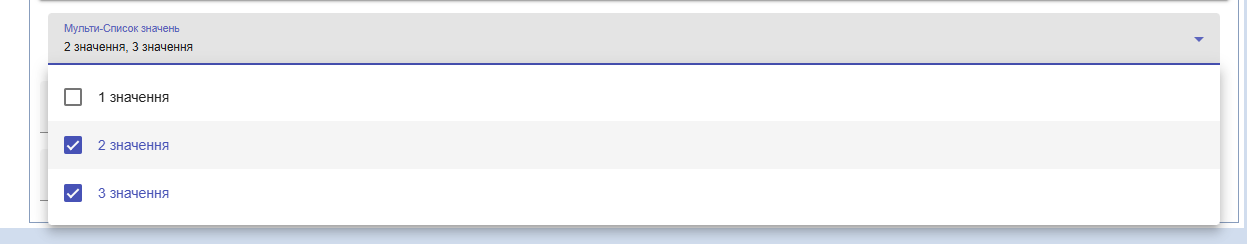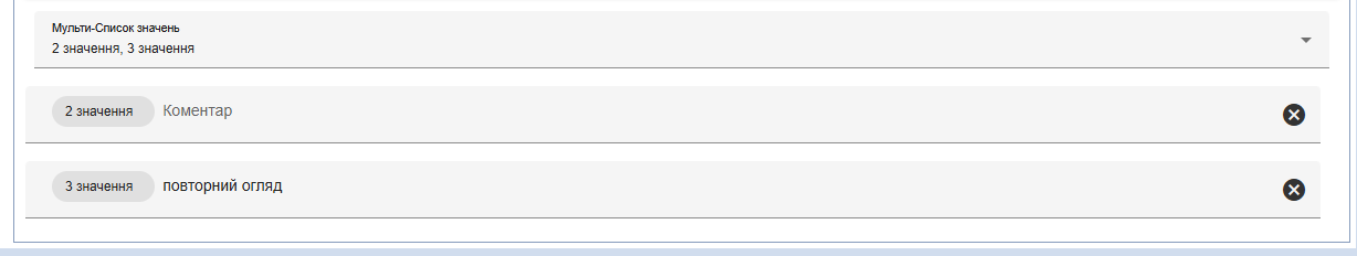 - Мульти-Список - елемент, який містить у собі декілька значень і з цього переліку можна обрати декілька значень одночасно. А також до кожного значення можна додати коментар за замовчуванням, який потім можна буде відкорегувати при роботі з формою і відповідно відображати його або не відображати;