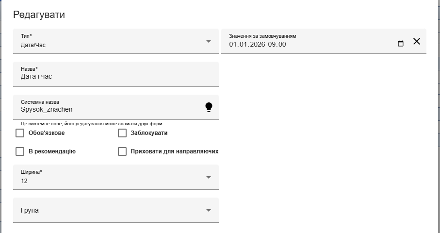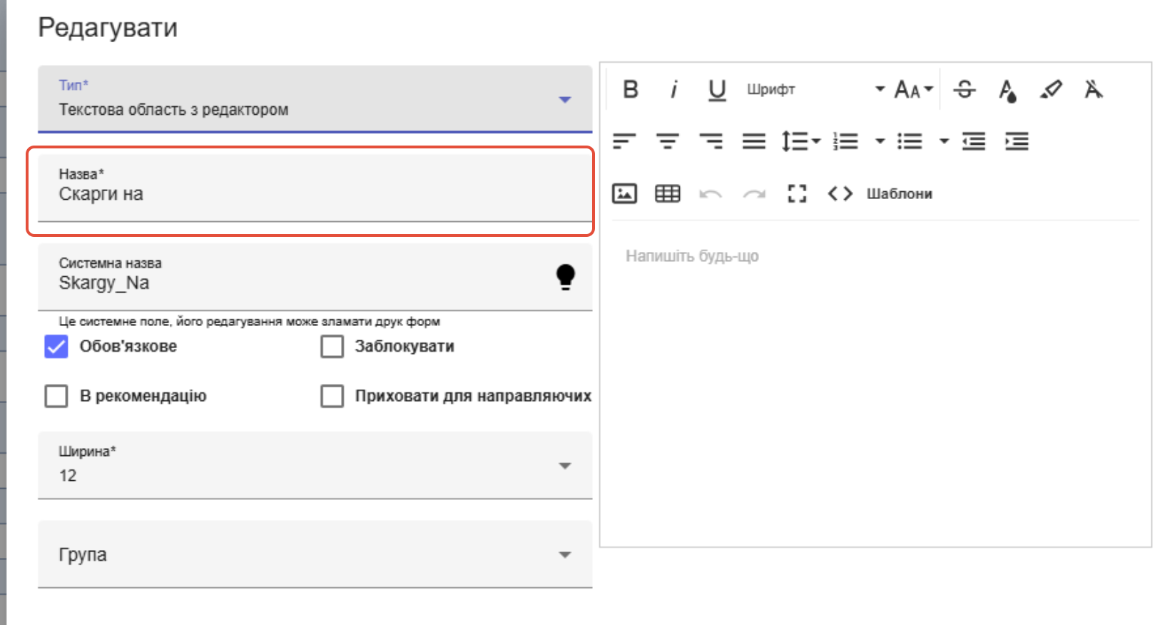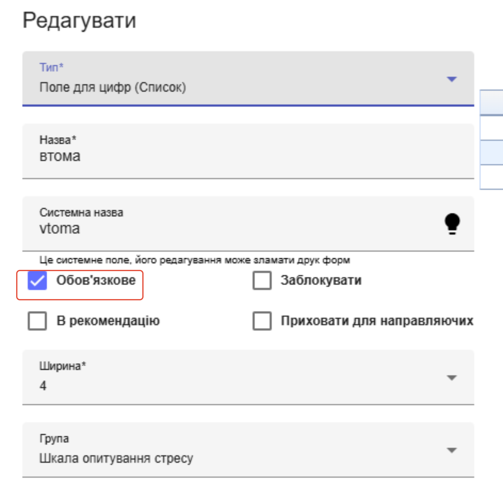 6. Обов'язкове - зазначаємо чи є поле обов'язковим для заповнення, якщо так, то з'явиться зірочка біля назви поля та не дасть зберегти дані без відсутньої інформації в цих полях;