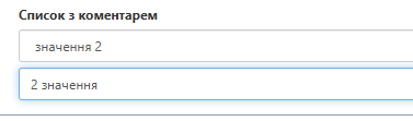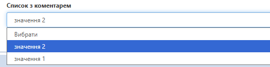 - Список з коментарем - елемент, який містить у собі декілька значень і з цього переліку можна обрати тільки 1 значення та до нього можна прописати коментар. Коментар за замовчуванням можна як відображати так і не показувати;