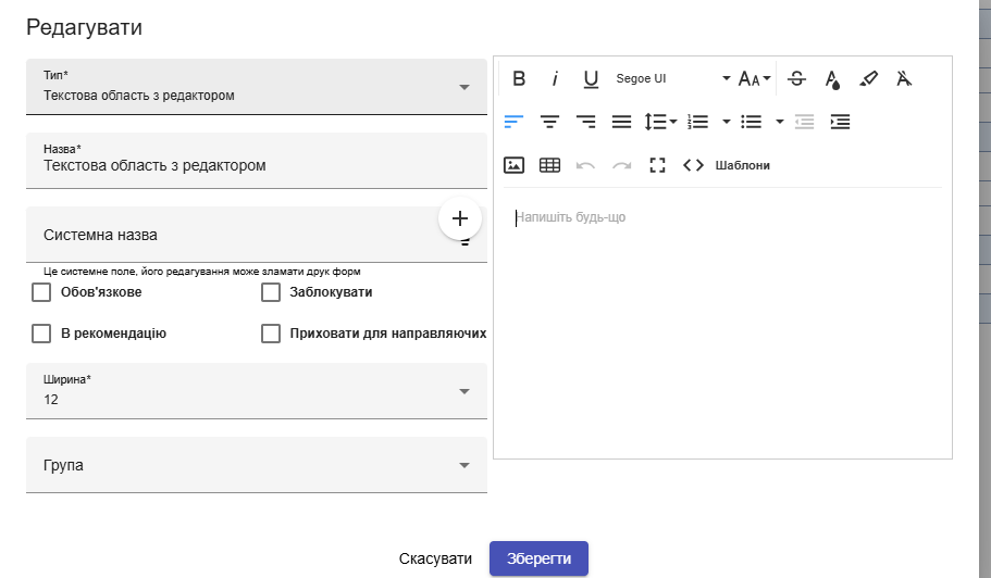 - Група - елемент, який може об'єднувати необхідні поля в один блок. Візуально група ділить відображення шаблону форми на певні блоки. Створені групи будуть відображатись зверху редактора, можна змінювати порядок їх розташування і т.д;