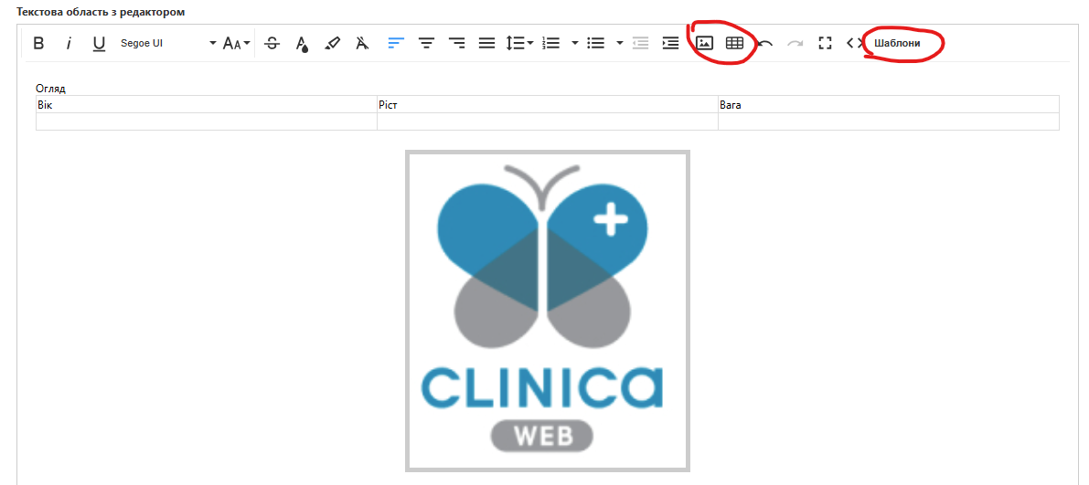 - Текстова область з редактором - елемент, який містить розширене поле для введення тексту та містить свій власний інструмент для редагування тексту (редактор). Тут можна вже застосовувати різні шаблони протоколів, які створені у пункті меню "Шаблони" - "Протоколи лікарів"(детальніше тут) також вставляти зображення і таблиці;