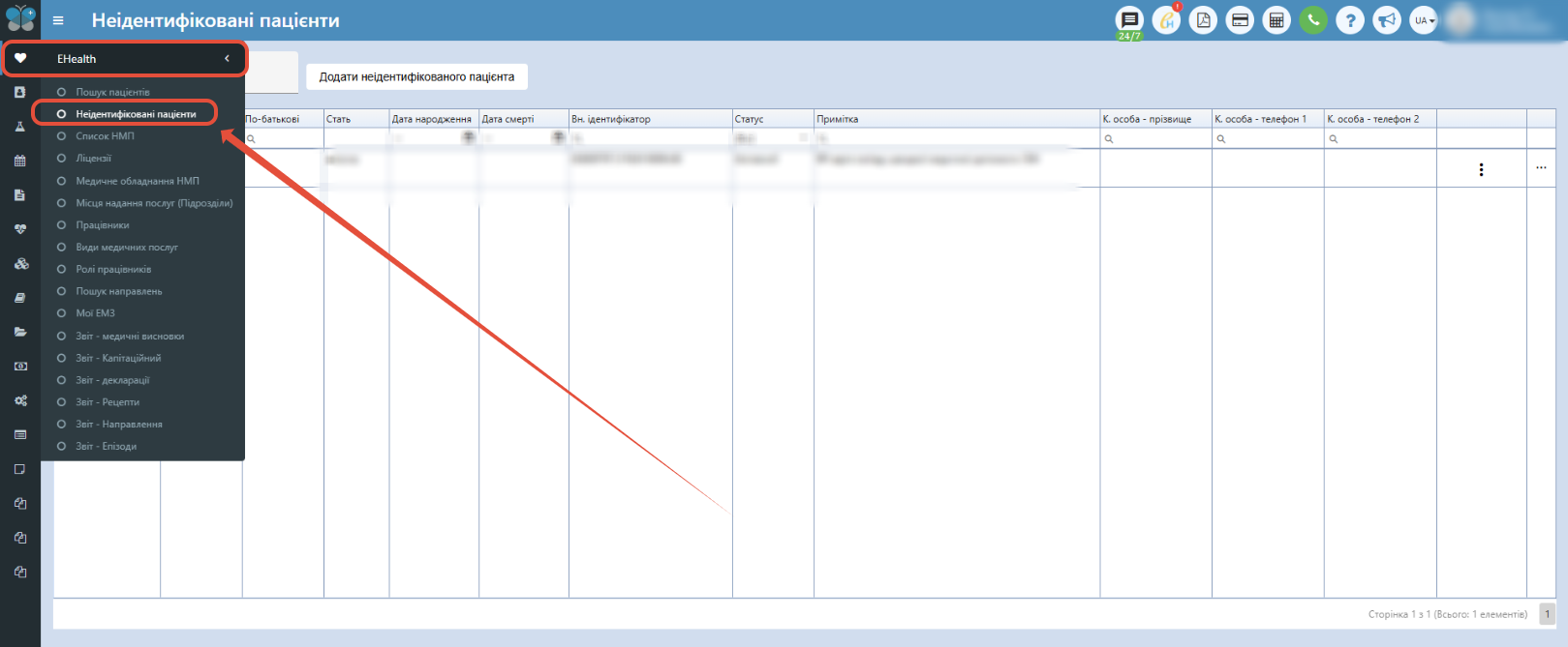 2. Перейти у пункт меню "EHealth" - "Неідентифіковані пацієнти";