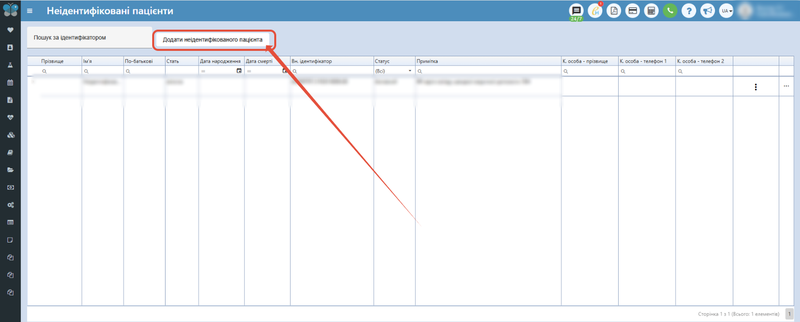 3. Натиснути на кнопку "Додати неідентифікованого пацієнта";