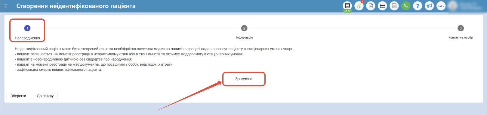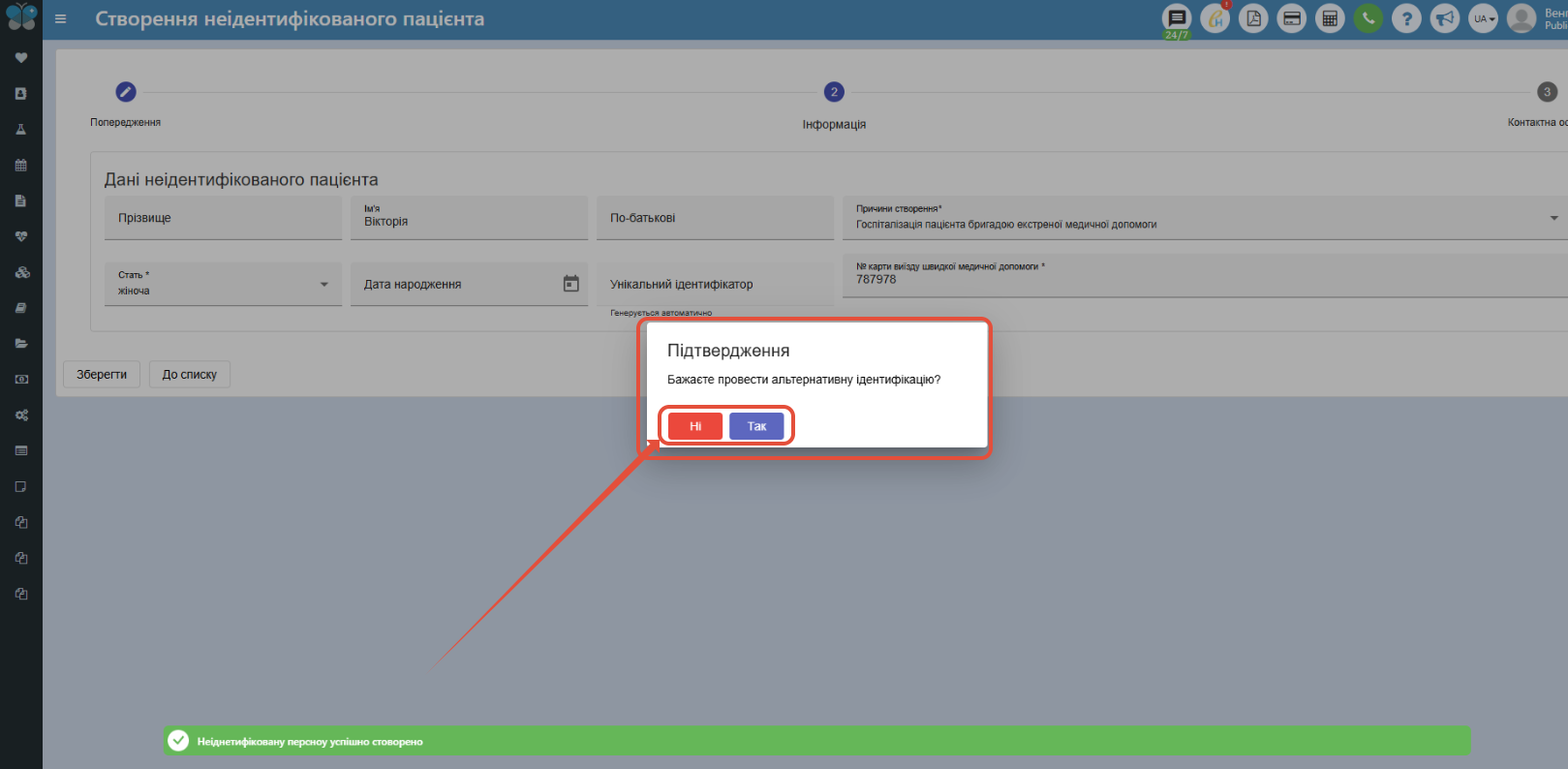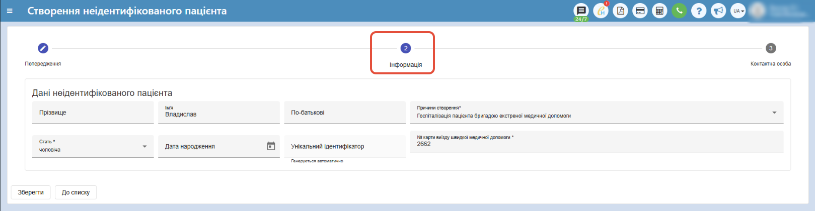 - Покрокові дії реєстрації неідентифікованого пацієнта