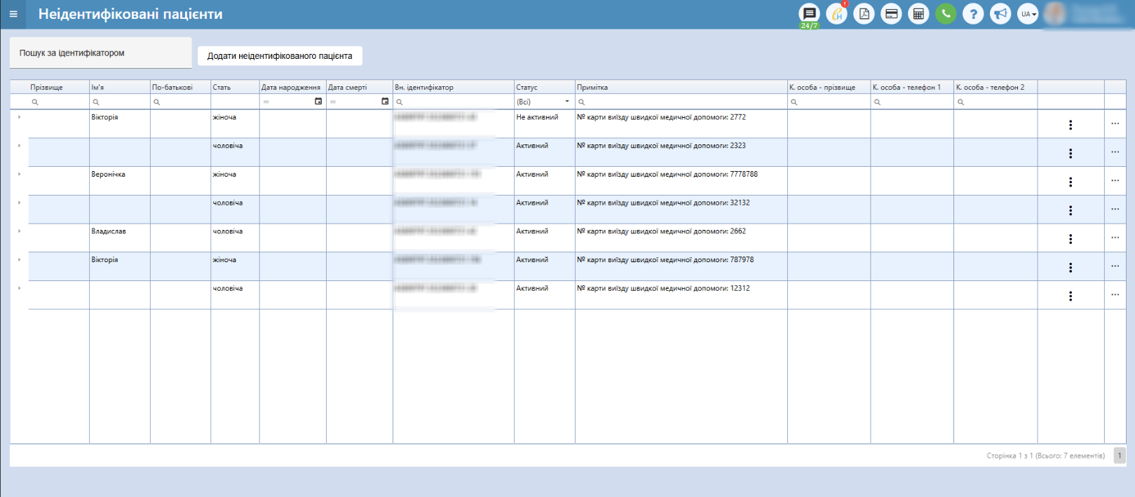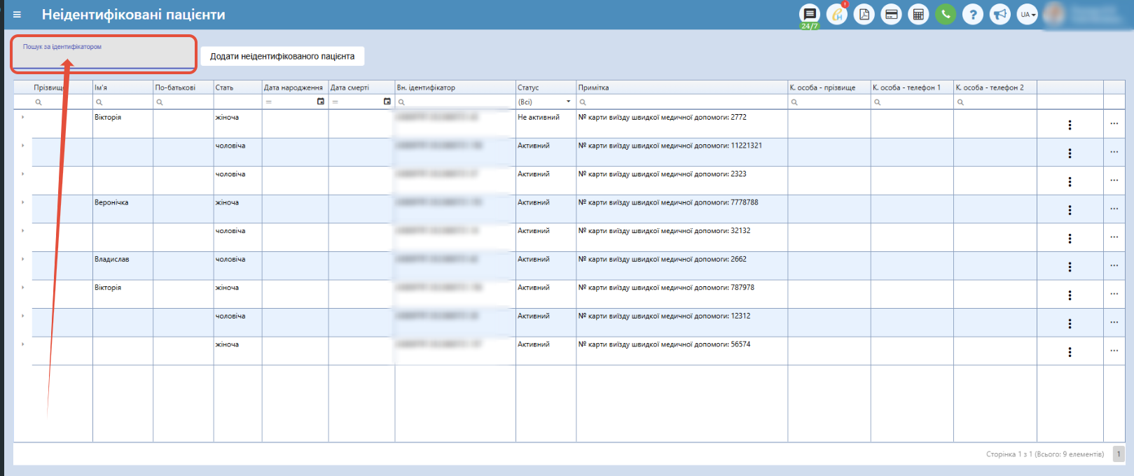 На сторінці зі списком усіх неідентифікованих пацієнтів є можливість пошукати потрібного пацієнта за допомогою пошуку ліворуч. Пошук відбувається за ідентифікатором.