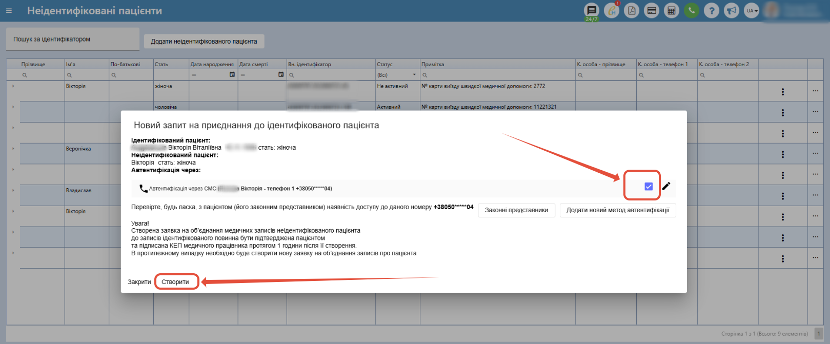 Для підтвердження Ваших дій необхідно ідентифікувати пацієнта за допомогою методу автентифікації, обираємо та натискаємо на кнопку "Створити".