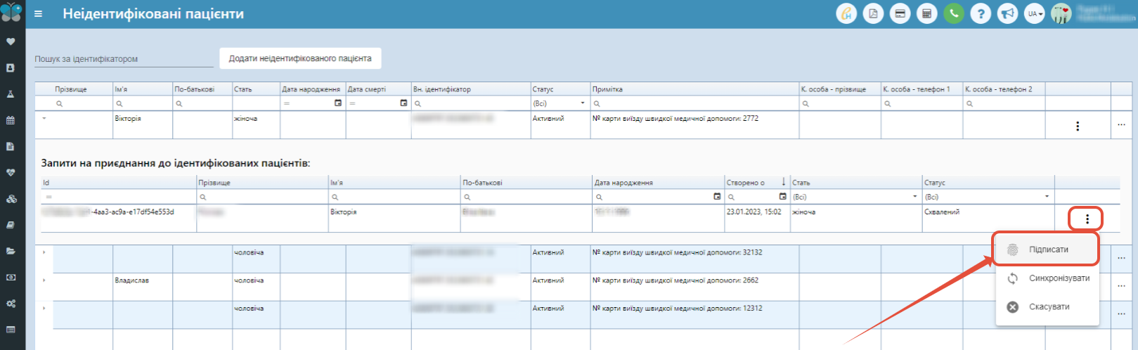У випадку, якщо дані про неідентифікованого пацієнта стають відомими, ОБОВ'ЯЗКОВО провести реєстрацію ідентифікованого пацієнта в системі eHealth (детально, ознайомитись можна тут) та приєднати неідентифікованого пацієнта до ідентифікованого. Зробити це можна, натиснувши на кнопку "три крапки" та обрати "приєднання пацієнта".
