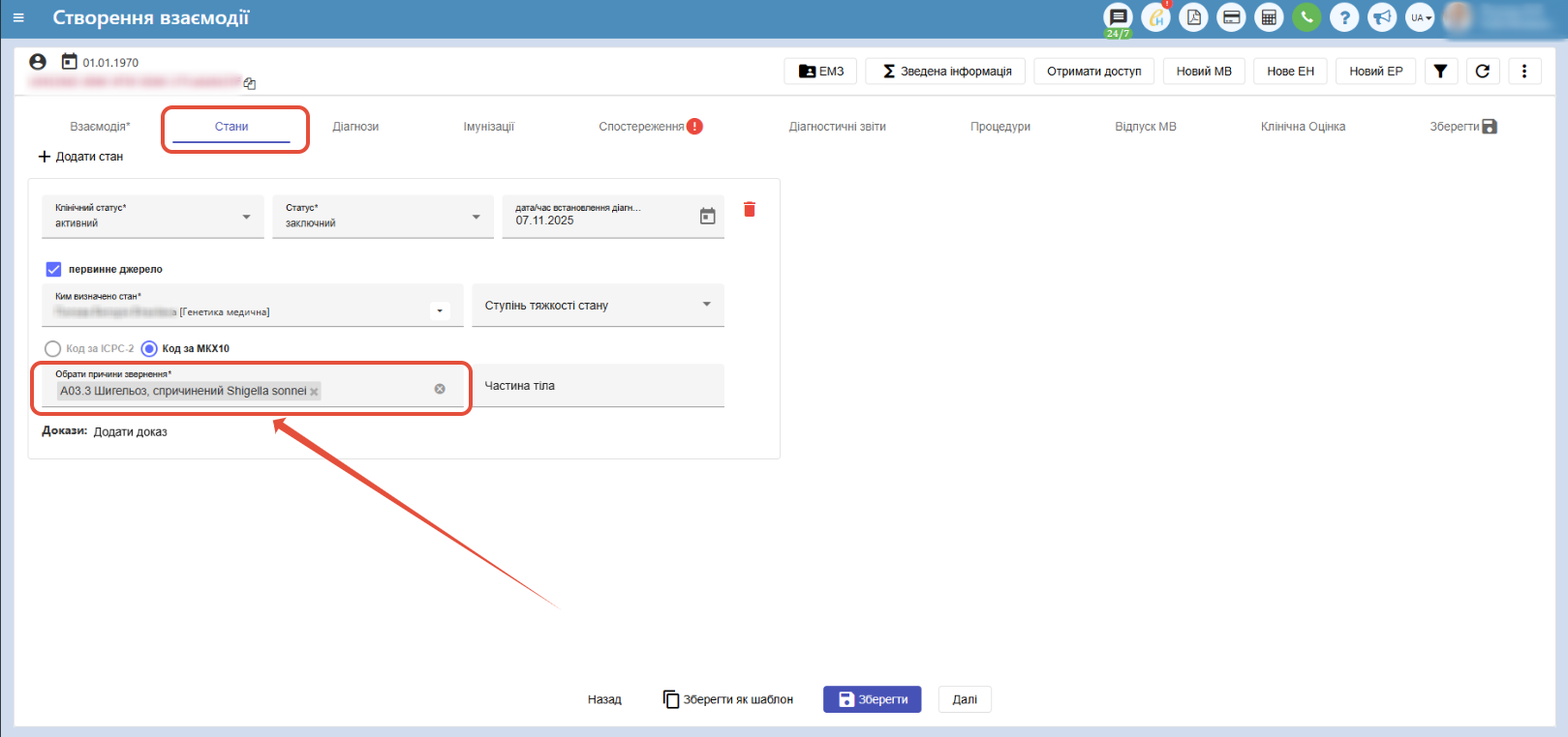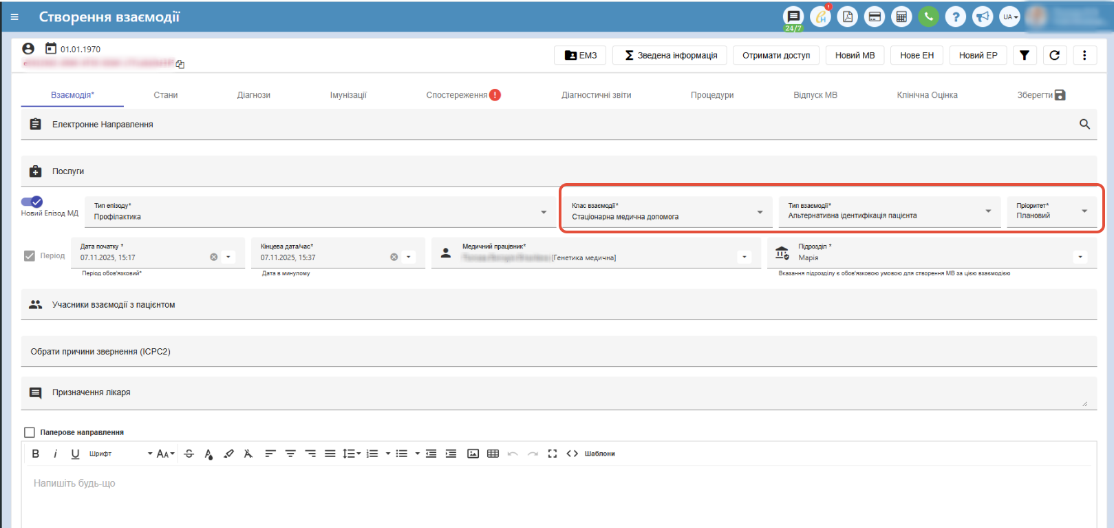 Після натиснення на кнопку "Так", користувача перенаправляє на сторінку створення взаємодії та деякі поля вже будуть заповненні автоматично. Залишається внести всі необхідні інші поля, зазначити стан та внести інформацію у спостереження.