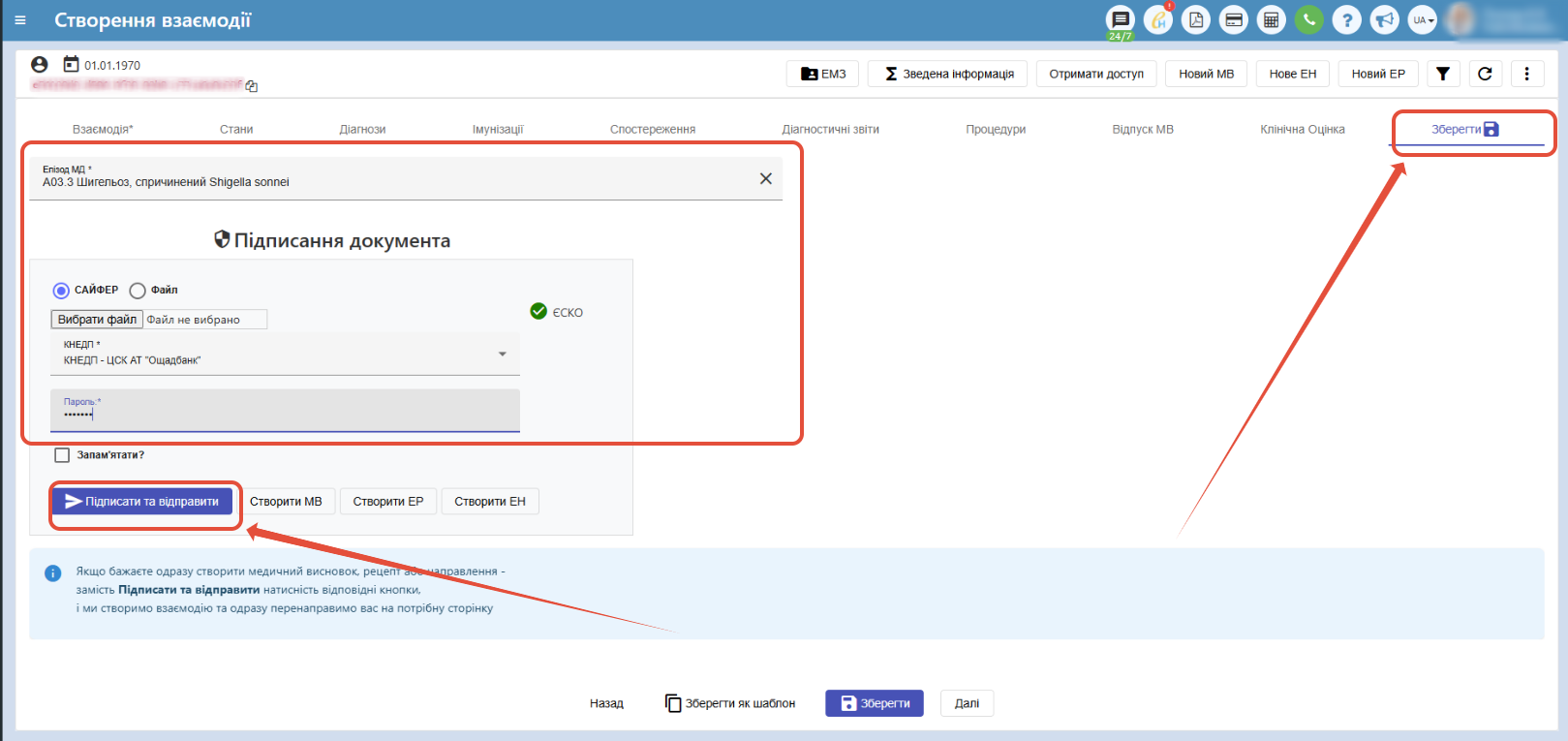 Після заповнення даних взаємодії, натискаємо "Зберегти" та підписуємо і відправляємо взаємодію.
