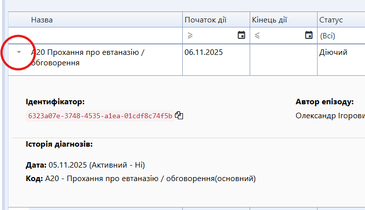 для того щоб переглянути розширену інформацію про епізод, лікар може натиснути на символ що обведений: