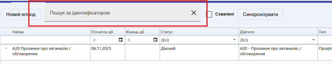 лікар також може скористатись доступнифи фільтрами, для пошуку конкретного епізоду МД, або знайти епізод за ідентифікатором, в полі над переліком епізодів:
