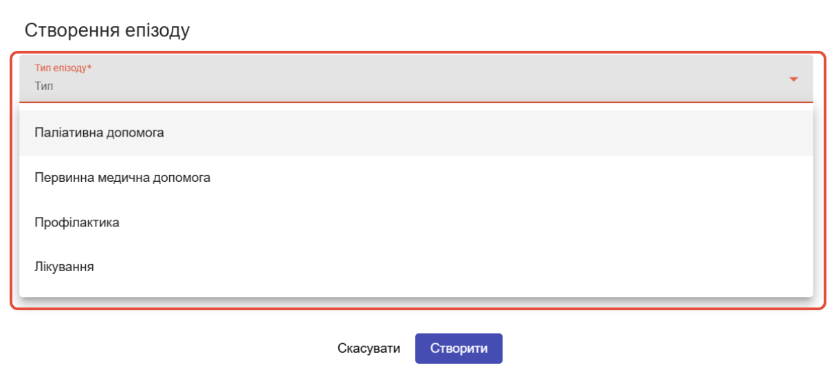 Перелік типів епізодів залежить від типу надавача медичних послуг, і для вторинної ланки може відрізнятись.Взаємодія