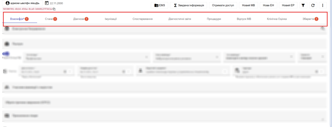 на верхній панелі сторінки створення взаємодії, користувач, може бачити перелік цих типів записів, та перевіряти, з якими розділами є проблеми з валідацією. Лікар може перейти на будь який розділ, та додати відповідний медичний запис до поточного пакету взаємодії.