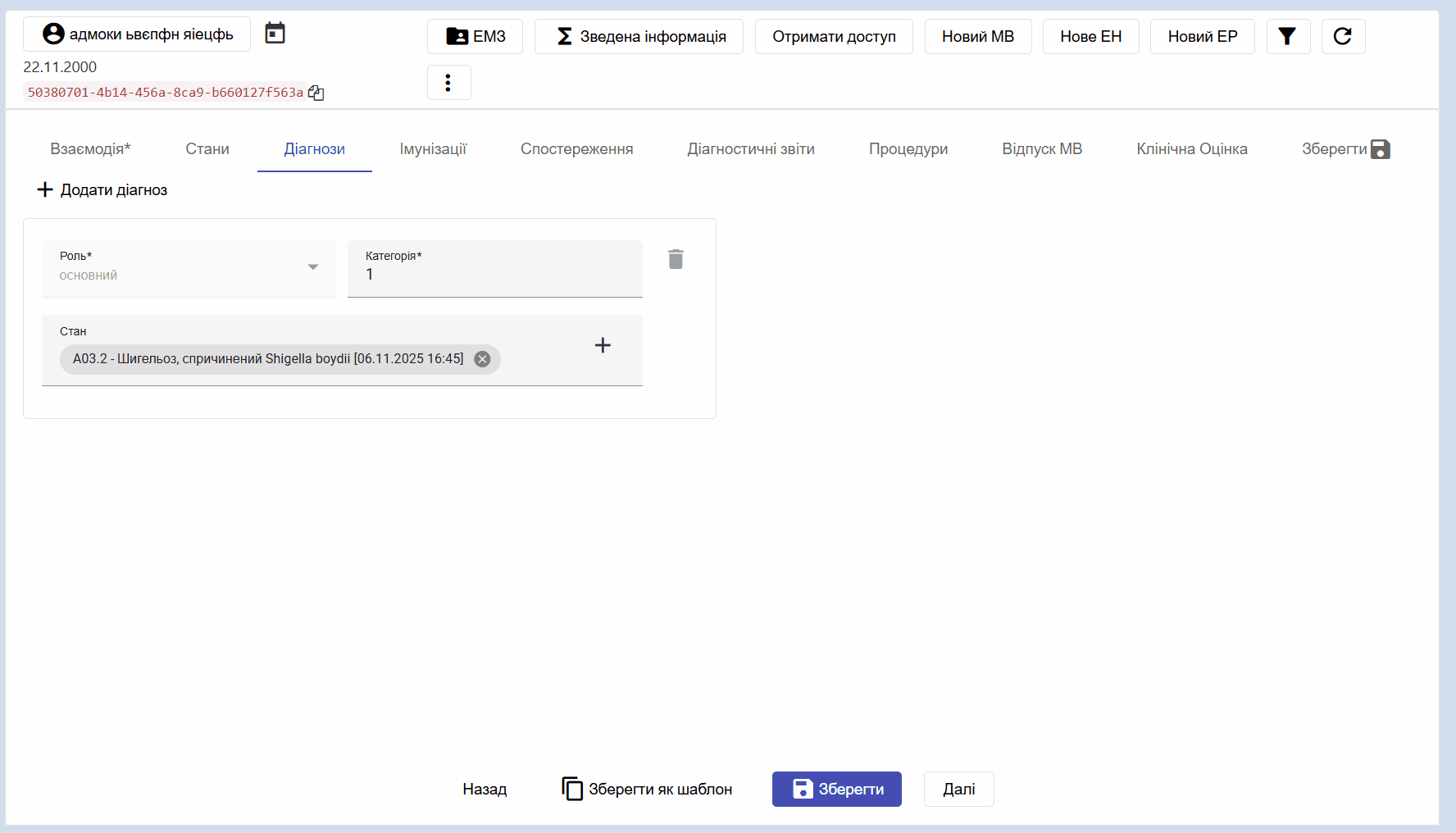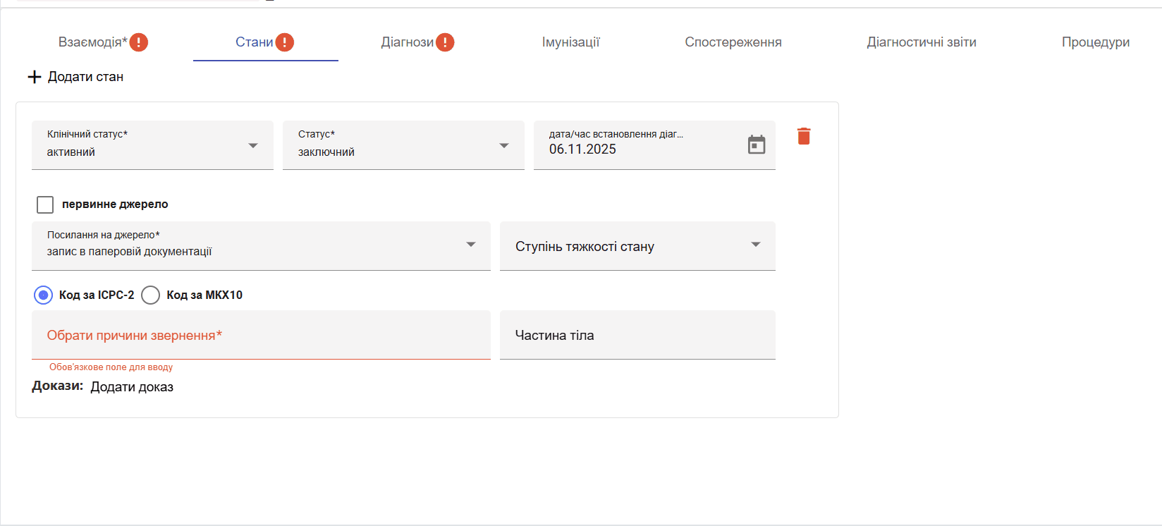 Для створення пакету взаємодії, необхідно обов'язково заповнити 1 основний діагноз. Діагноз це конкретний запис про стан пацієнта, він може бути обраний як з поточного пакету взаємодії, так і з попереднього. За замовчуванням система пропонує зарєеструвати новий стан та діагноз. При чому - вказавши код стану - він автоматично перенесеться в основний діагноз. (за необхідності лікар може це скоригувати та обрати інший стан для ідагнозу).