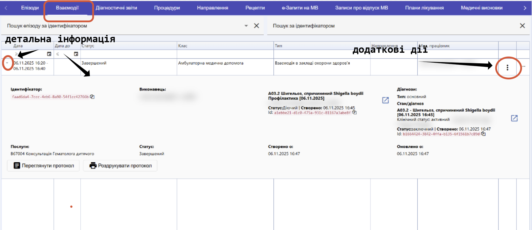 в картці пацієнта, лікар може переглянути усі доступні йому взаємодії з пацієнтом, шукати за ідентифікатором взаємодії, епізоду, переглядати детальну іфнормацію по взаємодії