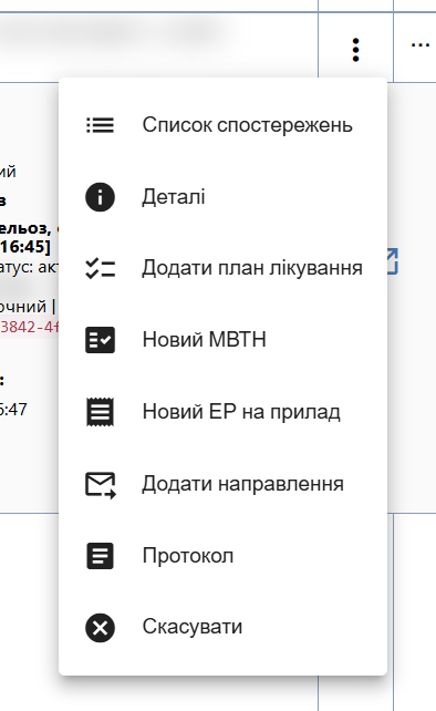 лікар може натиснути на три вертикальні крапки, в рядку з епізодом, у меню що з'явиться - обрати необхідну дію.