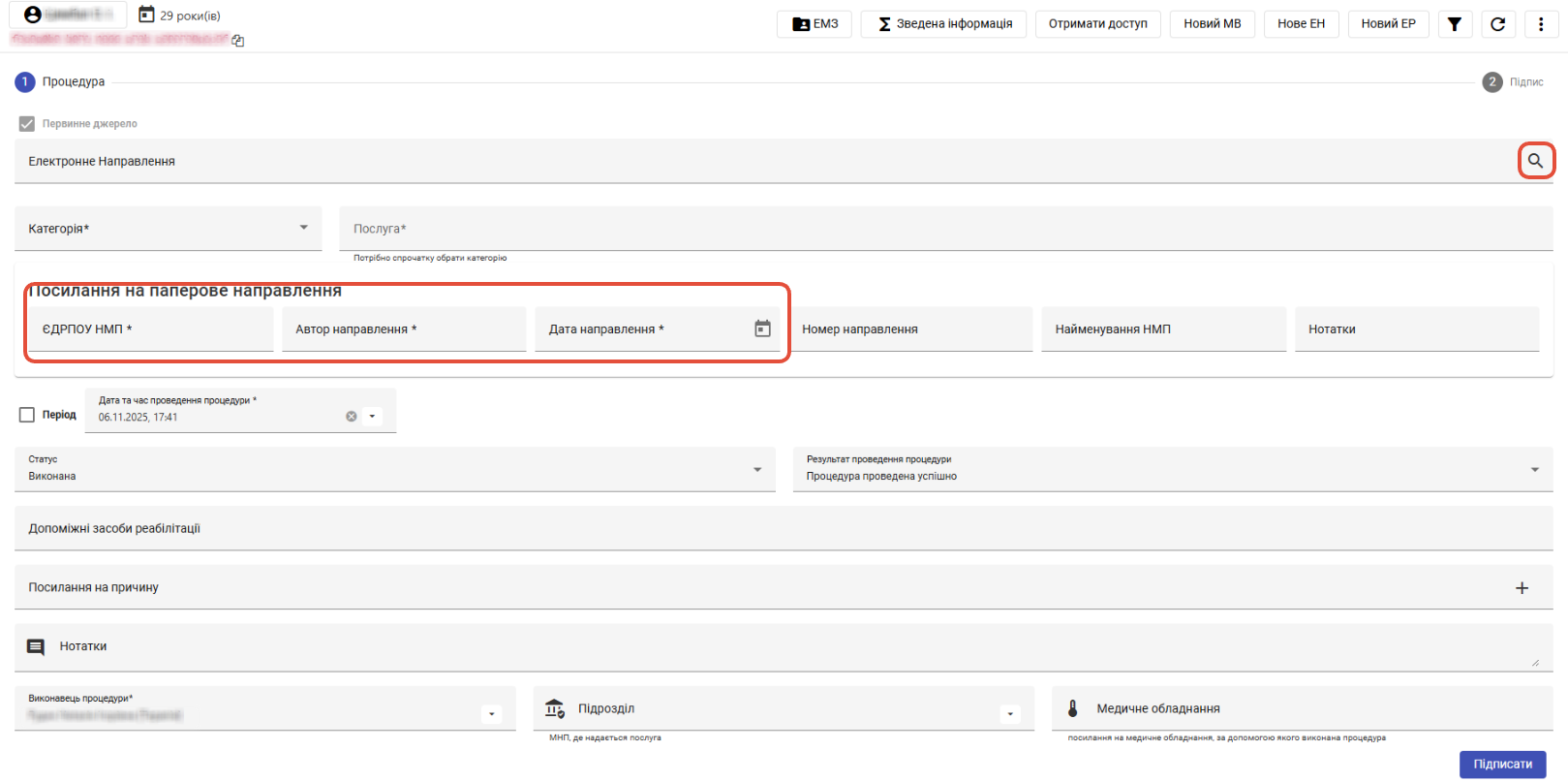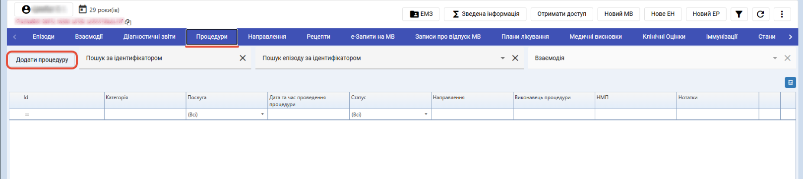 - Або - В карті пацієнта на сторінці ЕМЗ на вкладці Процедури натиснути кнопку "Додати процедуру". В цьому випадку необхідно буде вказати дані про направлення.