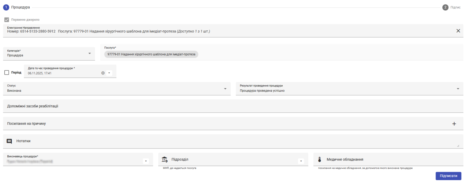 - Оберіть статус процедури зі списку - Виконана чи Не виконана.