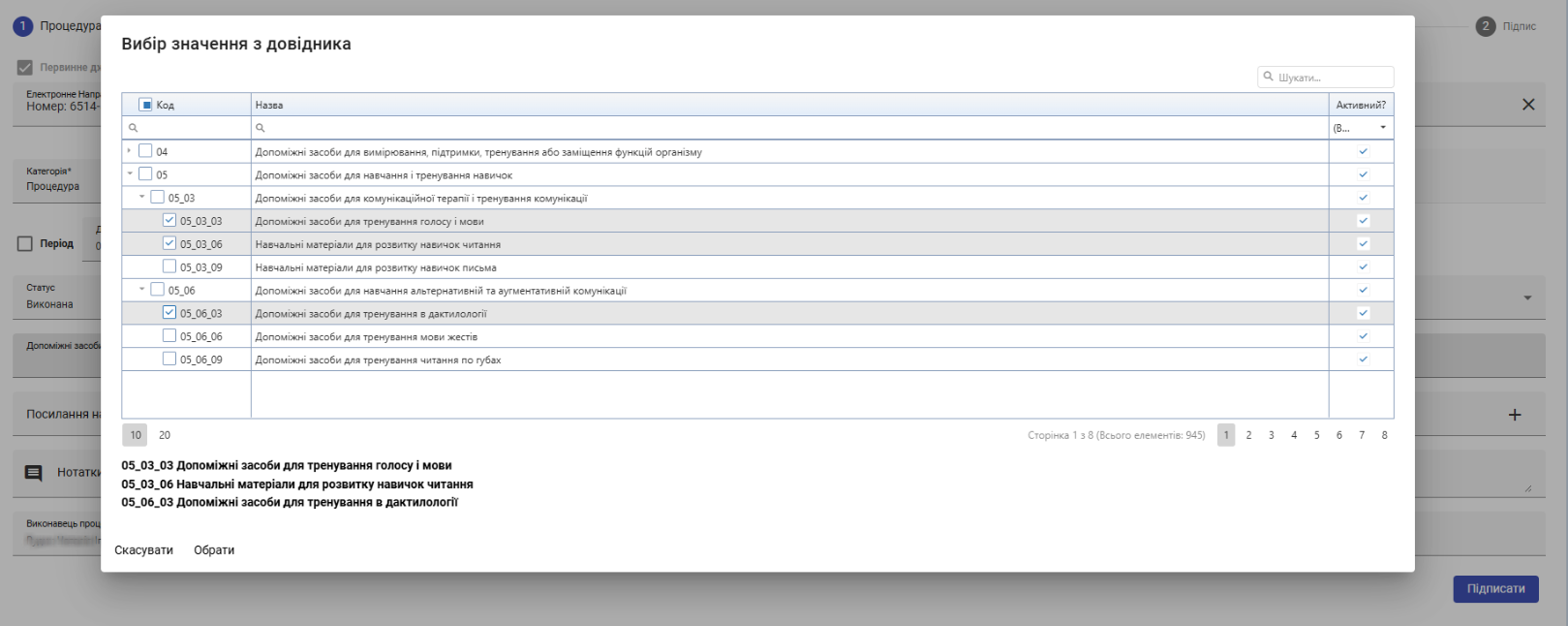 - Допоміжні засоби реабілітації - за потреби натисніть на поле та у вікні, що відкриється, оберіть прапорцями одне чи декілька необхідних значень.
