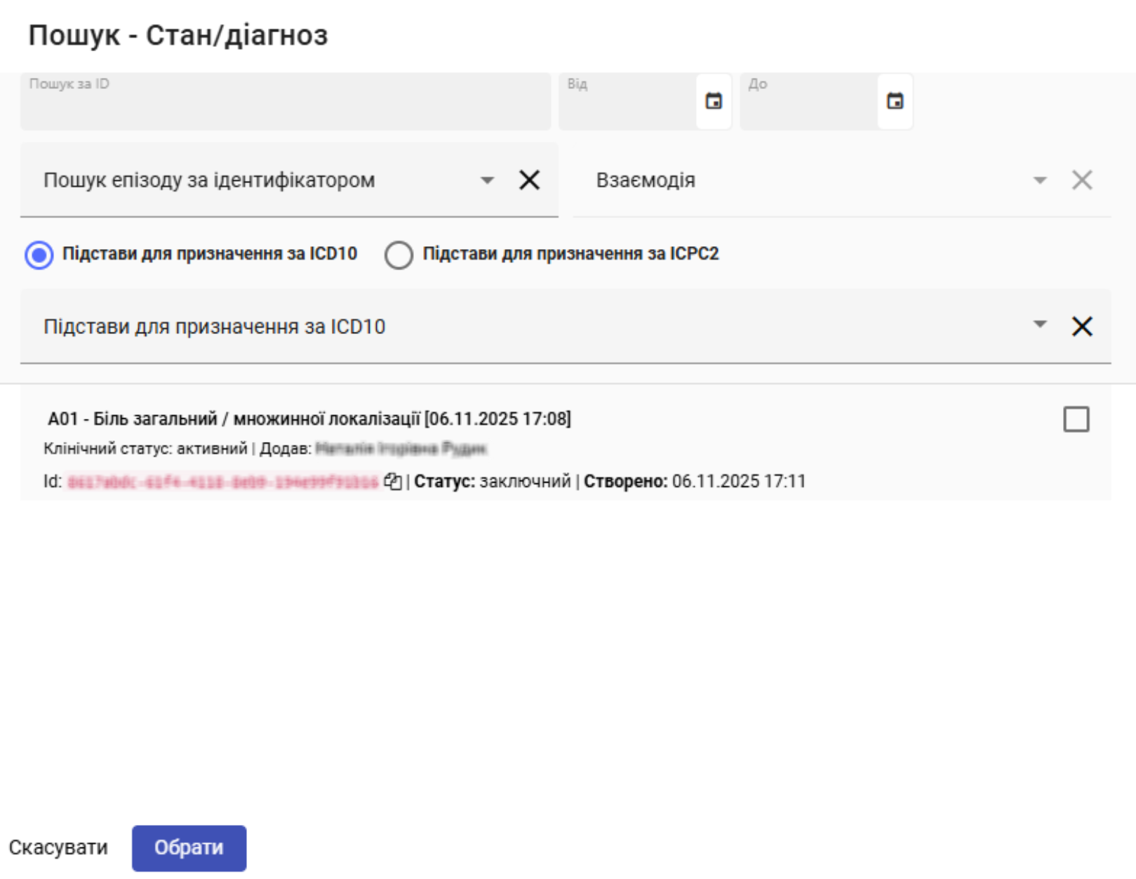 - Посилання на причину - натисніть на "+", щоб обрати стан/діагноз з раніше створених взаємодій.