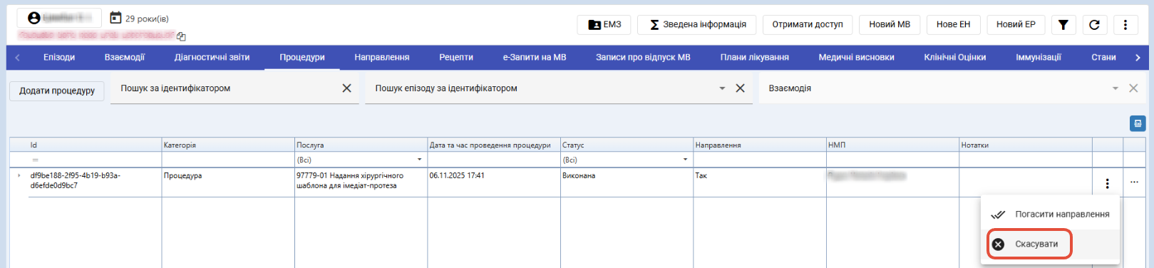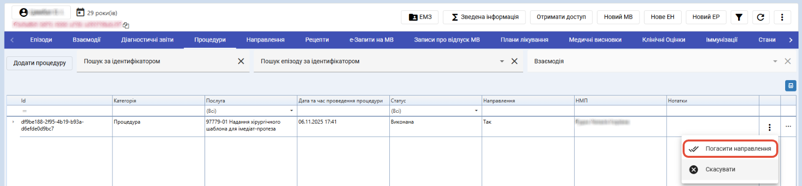 За допомогою створеної процедури можна погасити електронне направлення, по якому проводилась процедура. Для цього натисніть на "три крапки" та оберіть "Погасити направлення".