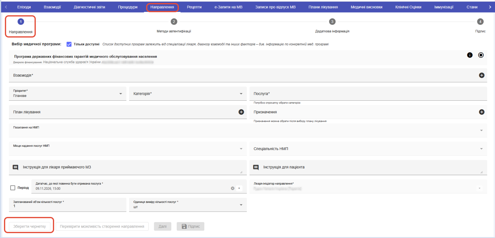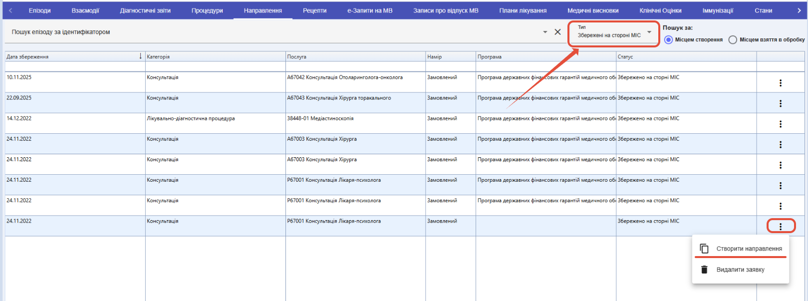 Збережені чернетки можна переглянути на сторінці "Направлення" в полі тип обрати "Збережені на стороні МІС", якщо її необхідно підписати натискаємо на кнопку "три крапки" та "Створити направлення":
