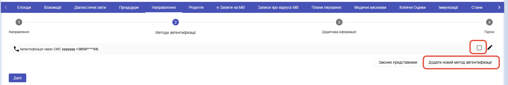 Тут зазначаємо прапорцем доступний метод для пацієнта (якщо його необхідно змінити, натискаємо на кнопку "Додати новий метод автентифікації") і натискаємо на кнопку "Далі".
