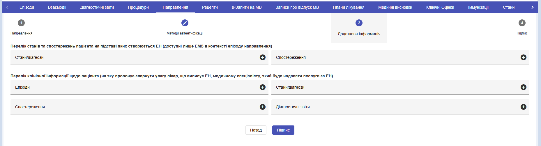 Останній крок - "Підпис". Як підписати запит на створення направлення детальніше можна ознайомитись тут. Після підписання дані будуть відправлені в eHealth. Якщо ще потрібно корегувати дані, можна на 1 кроці натиснути на кнопку "Зберегти чернетку", в такому випадку направлення буде збережено на стороні МІС.