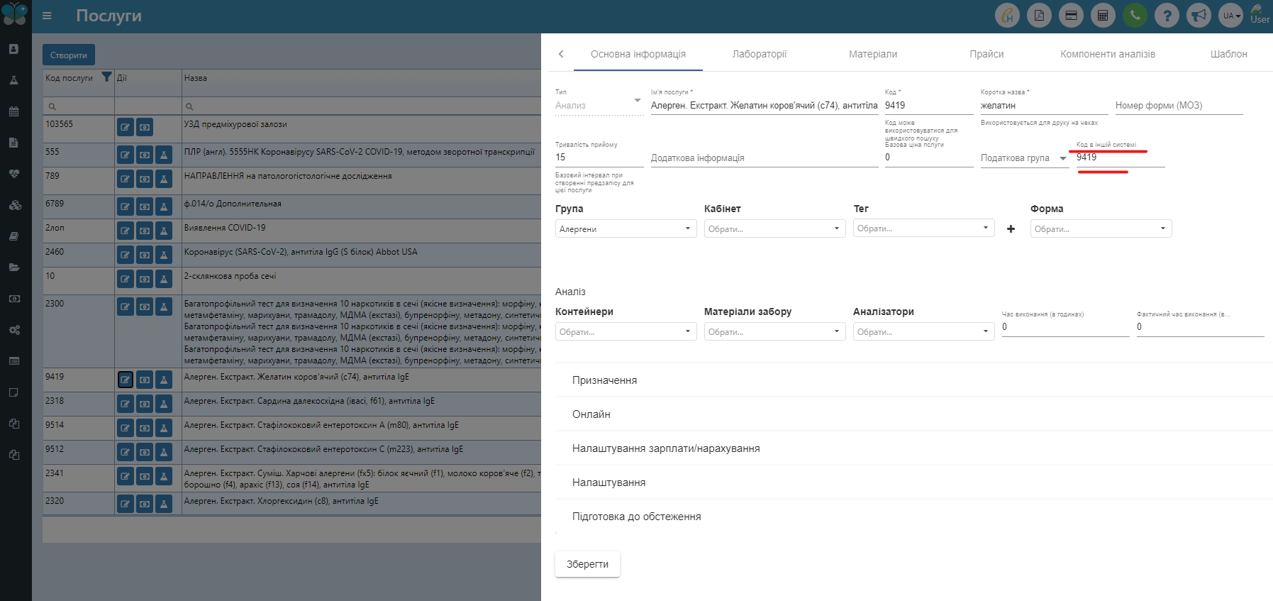 Послуги – а саме налаштування «Код в іншій системі». Цей код має збігатись з реальними кодами лабораторії Сінево.