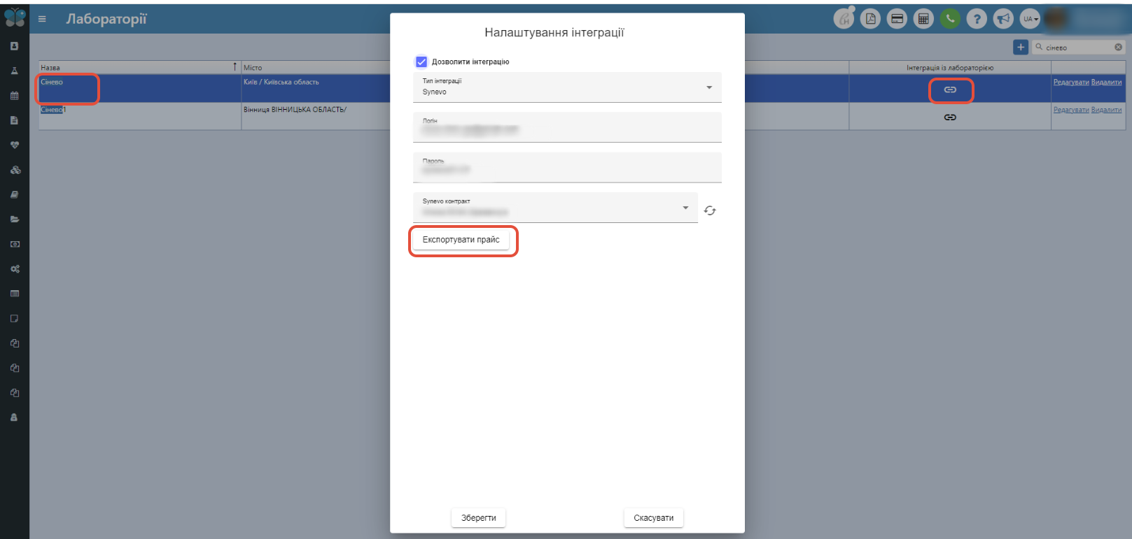 - Пункт меню "Налаштування" - "Лабораторії" - знайти лабораторію Сінево - натиснути на кнопку "Інтеграція із лабораторією" - "Експортувати прайс".
