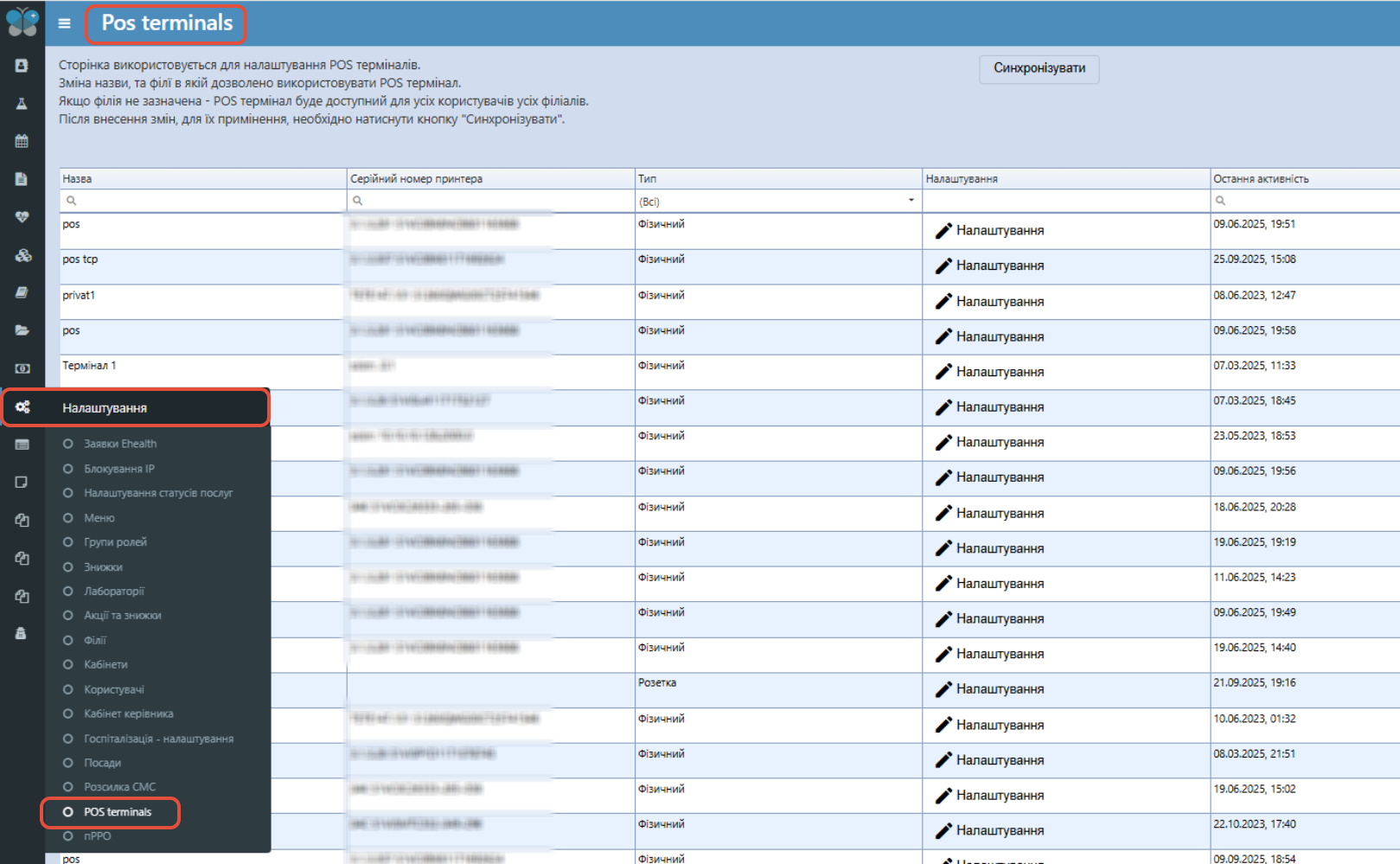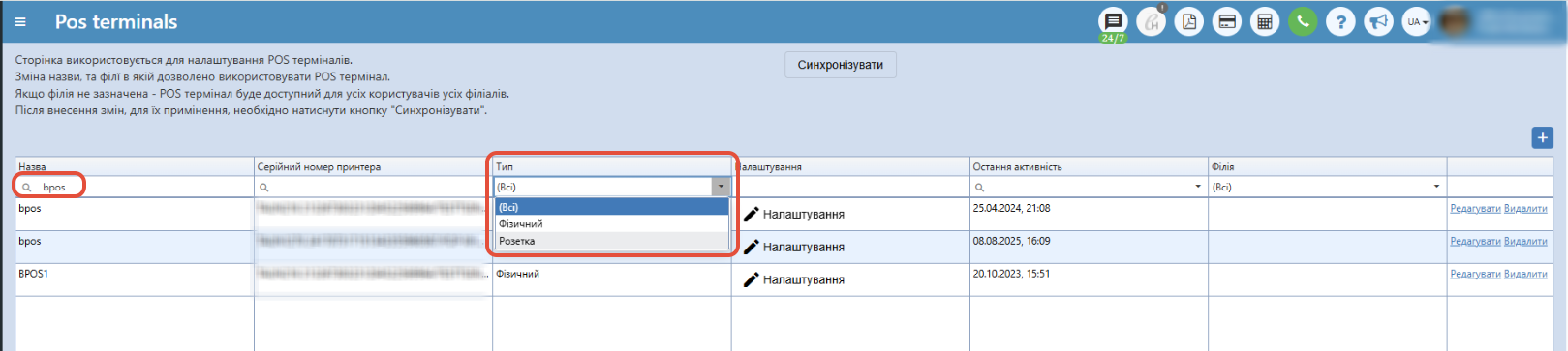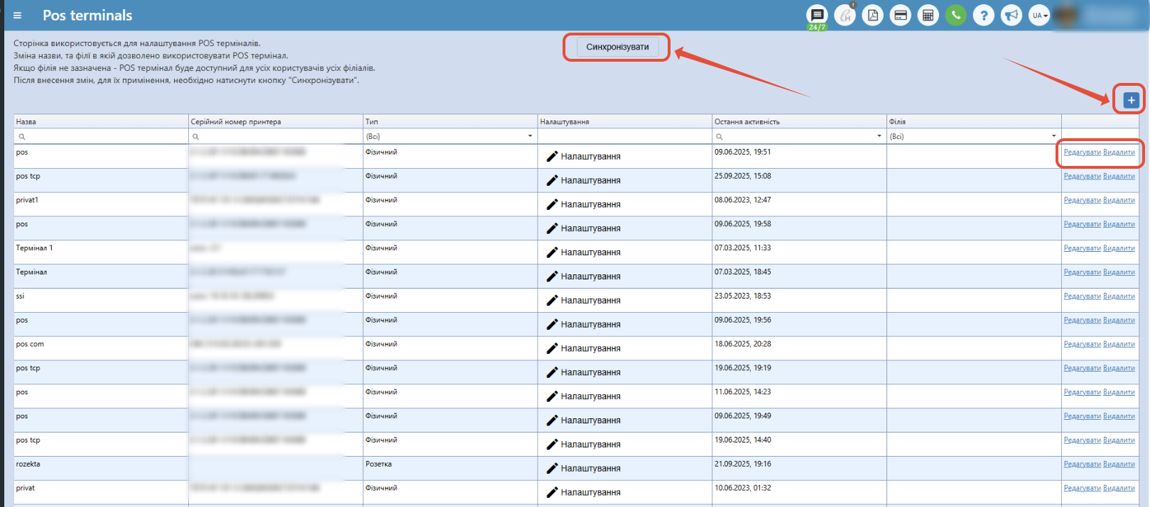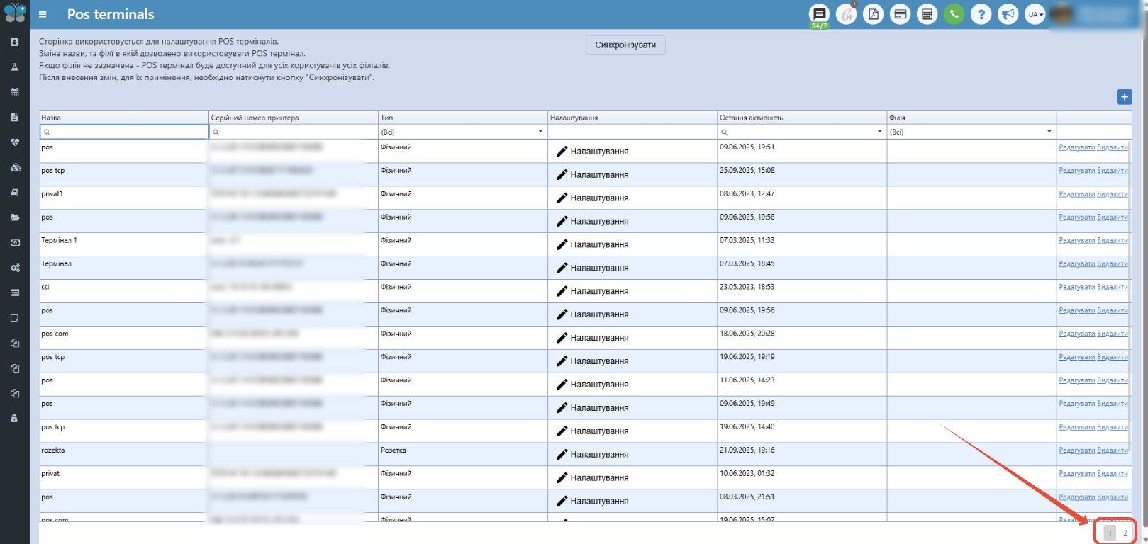 1) Праворуч зверху міститься кнопка "Синхронізувати" - дозволяє примінити зміни присвоєння філії пристрою, а також відобразити у списку всі термінали, які інтегруються з програмою.