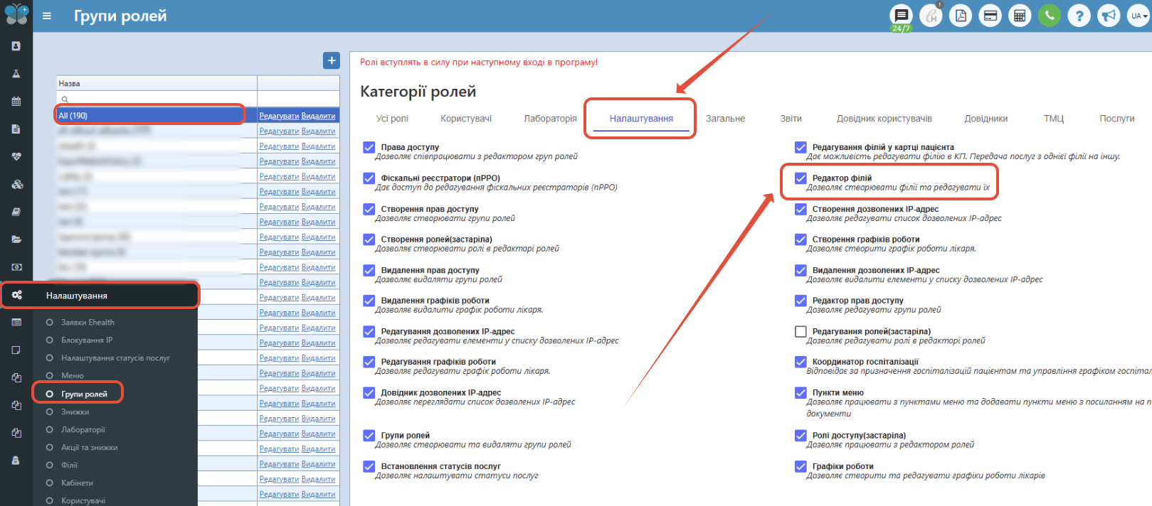 Для того, щоб працювати з даним модулем для Вашої групи ролей - пункт меню "Налаштування" - "Групи ролей" - на вкладці "Налаштування" - повинен стояти прапорець "Редактор філій".