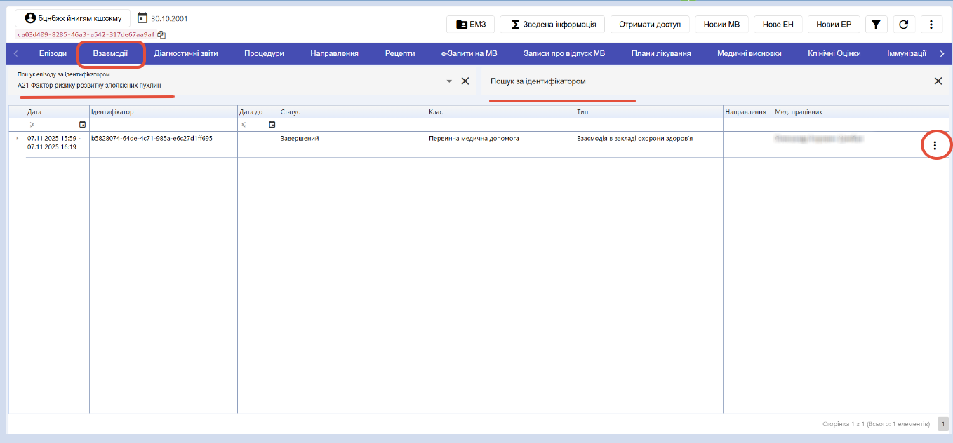 Першим кроком, лікар повинен обрати взаємодію для скасування, знайти її можна в карті пацієнта ЕСОЗ, в розділі "Взаємодії"