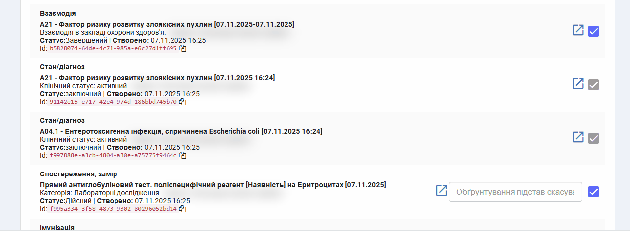 Також, відображатиметься перелік ЕМЗ що були подані в цьому пакеті взаємодії, лікар може обрати для скасування перелік ЕМЗ що були введені помилково (або скасувати весь пакет повністю), Якщо якесь ЕМЗ непотрібно скасовувати - користувач може зняти відмітку навпроти цього ЕМЗ. Також може зазначити обґрунтування індивідуально для обраного ЕМЗ. Скасовані будуть ЕМЗ у яких статус відмітки буде активним.
