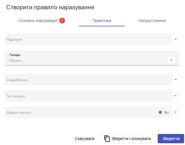 Тобто якщо є правило на філію загальне , і окреме правило на послугу в цій філії, то в першу чергу застосується більш точне правило з налаштуваннями по послузі. Така логіка буде застосовуватись до всіх полів прив'язки.