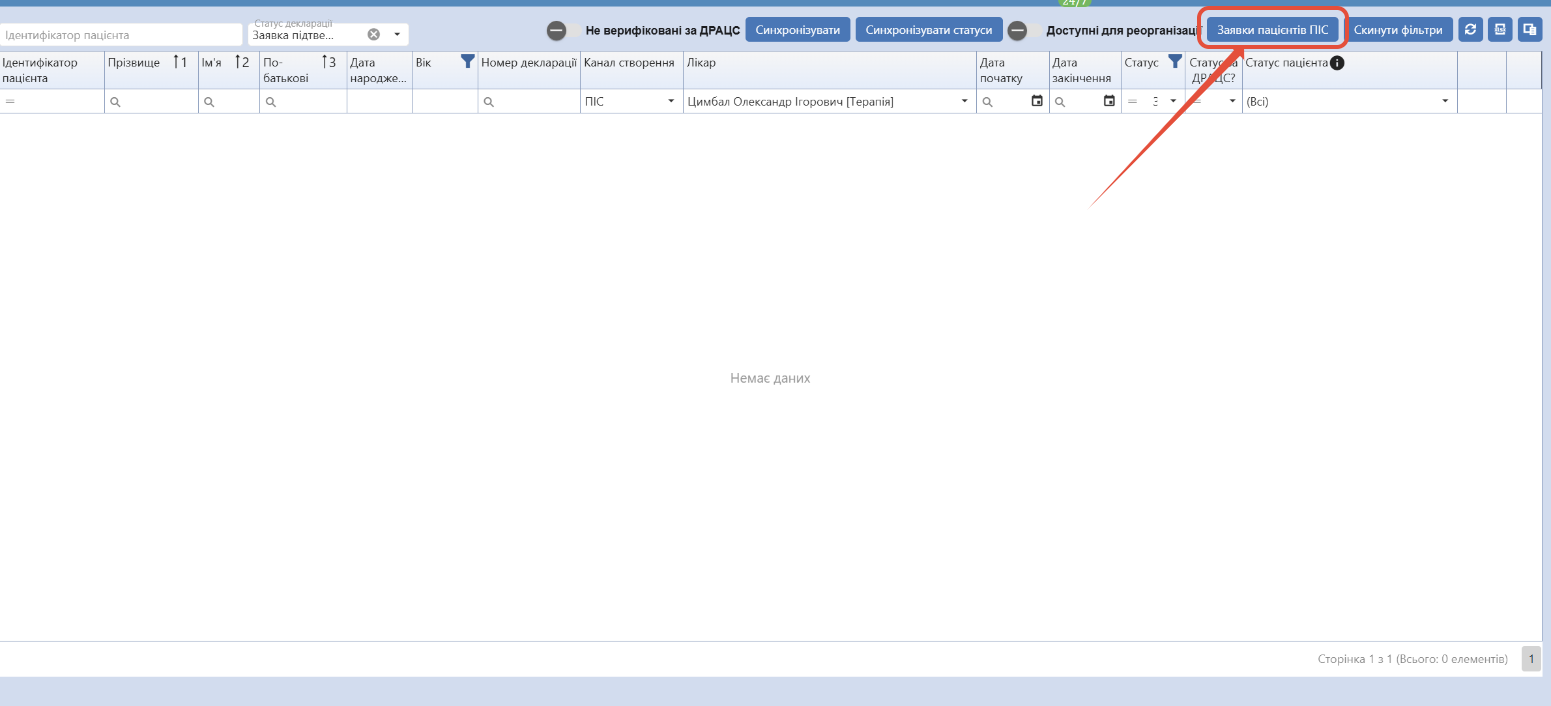 Щоб отримати перелік заявок на декларацію що були створені пацієнтами через пацієнтські інформаційні системи, користувач може натиснути на відповідну кнопку: